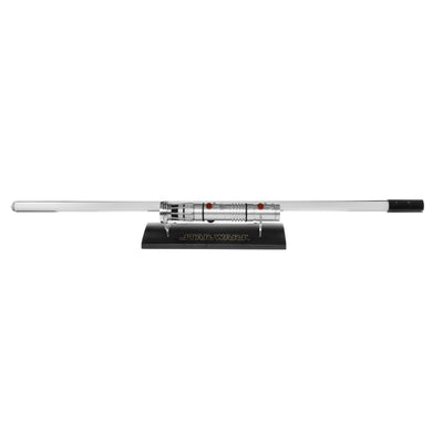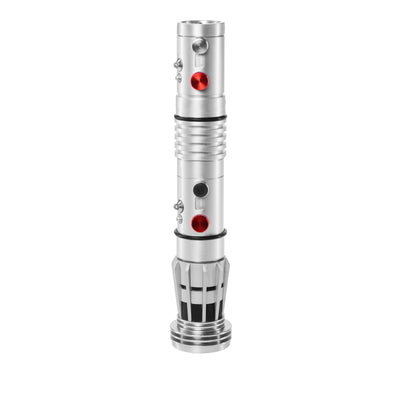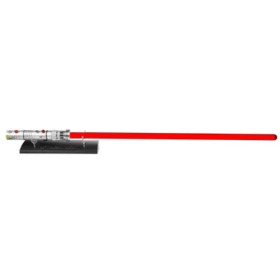 Eine Besonderheit Darth Maul's Lichtschwert ist, dass es zum Doppelklingenschwert aufgerüstet werden kann, wenn Du zwei seiner Lichtschwerter besitzt. Der beiliegende Adapter ermöglicht es, die beiden Griffe miteinander zu verbinden. Aber Vorsicht, Doppelklingenschwerter benötigen besonders viel Übung, sonst fehlt einem schnell die eine oder andere Gliedmaße...