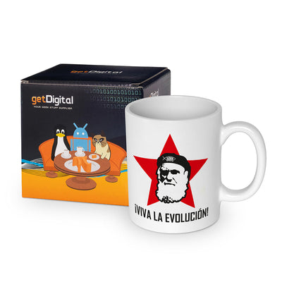 Als friedliche Nerds sind wir natürlich eher in Darwins Lager zu finden und zeigen diesen Umstand stolz mit dem "Viva la Evolución"-Becher. Der Spruch, der unter dem Antlitz des Evolutionsführers zu sehen ist, bedeutet "Es lebe die Evolution!". Obwohl wir nicht unbedingt aktiv an der Evolution mitwirken können, können wir zumindest dafür sorgen, dass mehr Leute zu der Erkenntnis kommen, dass die Evolution existiert! :)