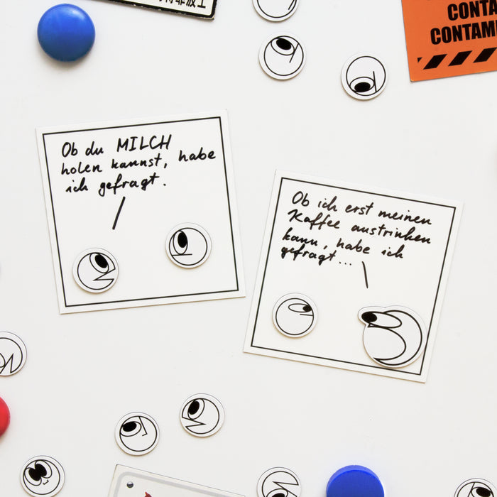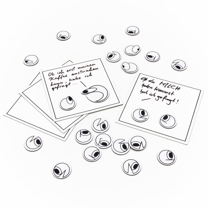 In diesem Kühlschrankmagnet-Set findest du 23 kleine Charaktere mit verschiedenen Gesichtsausdrücken, sowie 4 wiederbeschreibbare Magnettafeln. Die Tafeln kannst du zu einem vierteiligen Comic kombinieren und darauf mit einem nicht-wasserfesten Folienstift (nicht enthalten) deine eigenen Dialoge aufschreiben. Ob du so nun deinen Gefühlen Luft machst, deine Mitbewohnerin ans Milchholen erinnerst, oder einen Witz erzählst: Deine eigenen, einzigartigen Erzaehlmirnix-Comics rücken mit diesen Kühlschrankmagneten in greifbare Nähe!