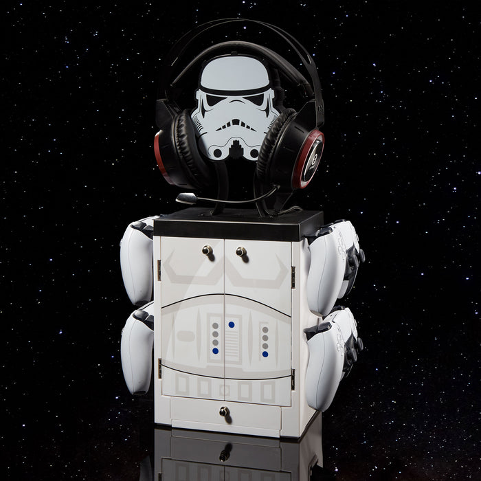 Endlich haben alle Dinge ihren festen Platz, denn der Gaming Locker bietet dafür jede Menge Stauraum. An den Seiten bringst du bis zu vier Controller unter und im Inneren finden zehn Spiel- oder Filmhüllen ihren Platz (natürlich nicht nur von Star Wars). Ein extra Fach für Kabel und Fernbedienungen gibt es auch. Und dein Headset oder deine Kopfhörer platzierst du ganz oben auf den Helm des Stormtroopers. Der Gaming Locker ist kompatibel mit dem Zubehör verschiedener moderner Spielekonsolen, zum Beispiel Playstation 4, Playstation 5 und Xbox One.