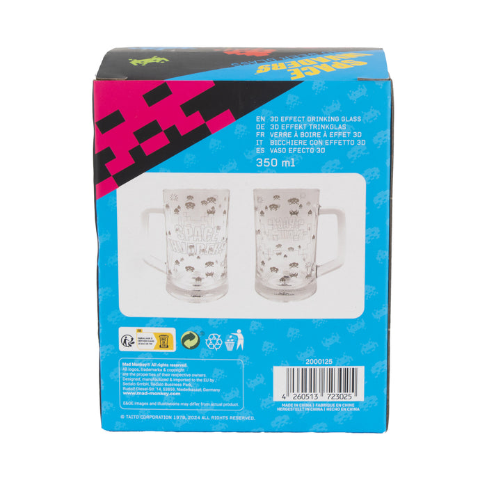 Das Bierglas besteht aus robustem Klarglas und bietet mit einem Fassungsvermögen von 350 ml genug Platz für dein Feierabendbier, eine Limo oder was auch immer dich beim nächsten Gaming-Abend begleiten soll. Die rundum gedruckten Space Invaders Motive – inklusive der klassischen Gegnerformation und dem bekannten Schriftzug – sorgen dafür, dass der nostalgische Vibe bei jedem Schluck mitkommt. Dank des stabilen Henkels liegt das Glas gut in der Hand.