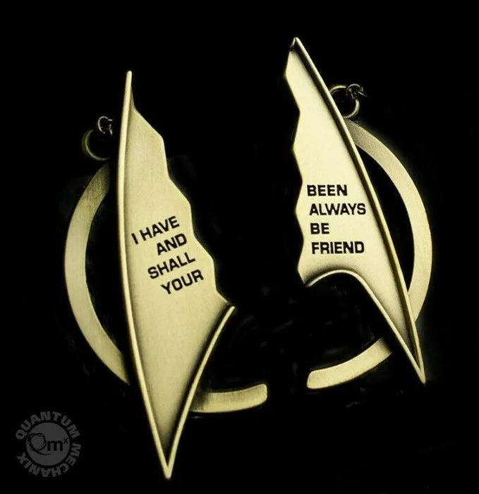 Die Star Trek Freundschaftskette von Quantum Mechanix zollt Tribut an eine der ikonischsten und emotionalsten Szenen der gesamten Star Trek-Geschichte. Auf dem durch Nahfeldmagnete zusammengehaltenen Anhängerhälften prangt das bewegende Zitat "I have been and always shall be your friend" ("Ich war und werde immer dein Freund sein."). Diese Worte, erstmals in "Star Trek II: Der Zorn des Khan" von Spock gesprochen, symbolisieren die tiefe Bindung und unerschütterliche Loyalität zwischen Captain Kirk und Spock. Quantum Mechanix hat es verstanden, die Essenz der Freundschaft, die im Zitat eingefangen ist, in ein elegantes Accessoire zu verwandeln.