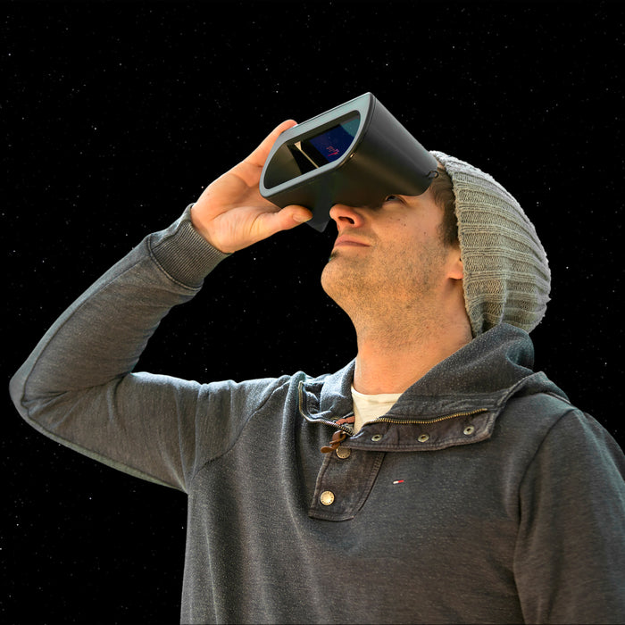 Das universe2go-Planetarium fürs Smartphone verbindet das Beste aus beiden Welten: den Blick auf den Nachthimmel und die Projektion von wissenswerten Informationen ins Blickfeld. Und dabei ist die Benutzung auch noch kinderleicht! Du musst einfach nur ein geeignetes Smartphone (siehe technische Details weiter unten) in das Gehäuse der universe2go-Brille einsetzen, die App starten (Aktivierungscode liegt bei) und in den Nachthimmel blicken. Über Spiegel werden Informationen zu den Sternbildern und anderen Himmelskörpern direkt über die echten Objekte am Himmel gelegt.