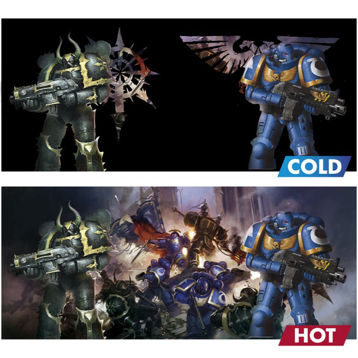 Der Thermoeffekt-Becher zeigt zwei Space Marines in ihrer übermenschlichen Pracht: Ein blauer Ultramarine, der für das Imperium kämpft, und ein Krieger der Black Legion, der dem Befehl von Abaddon dem Vernichter untersteht. Wenn du nun eine heiße Flüssigkeit wie Kaffee, Tee oder heiße Schokolade in den Becher gibst, wird im Hintergrund die erbitterte Schlacht zwischen den beiden Truppen sichtbar. Kühlt der Becher ab, sind wieder nur die beiden Space Marines zu sehen.